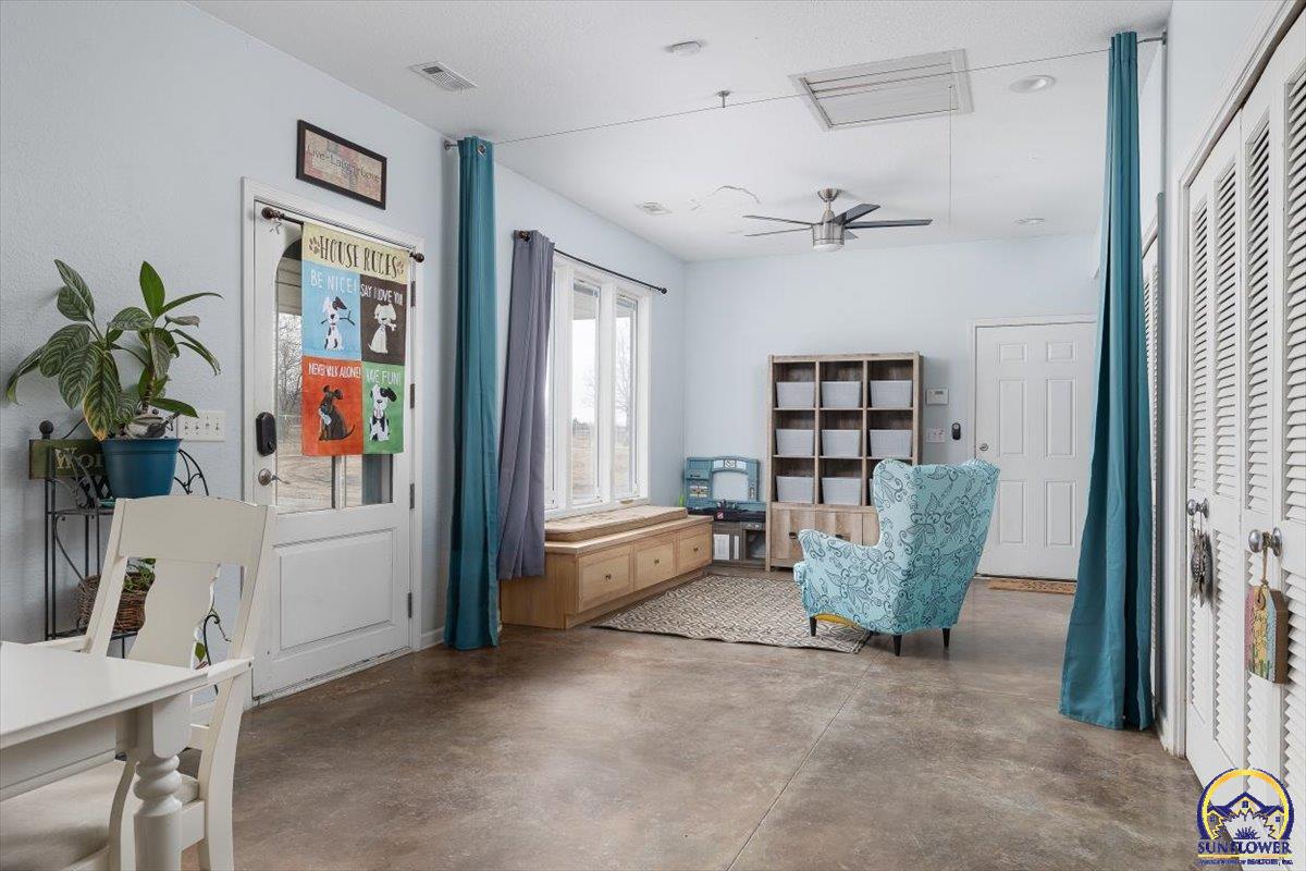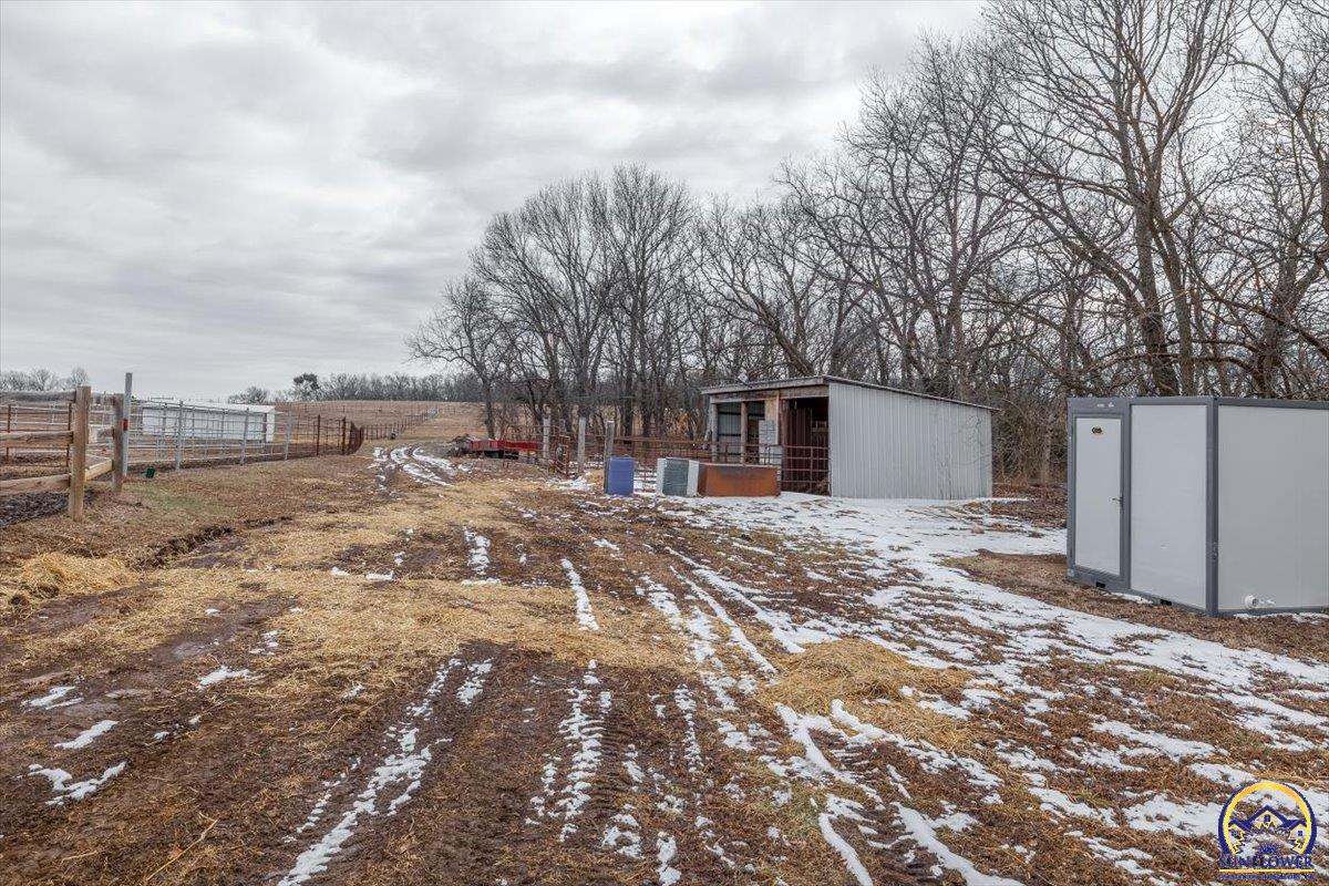 Welcome home to your dream Barndominium on 120+ acres surrounded by Perry Lake. Property offers a home with a 3 bedrooms, 2 bathrooms, Office, safe room, 3 Living areas, with an attached 4+ car garage. West yard has a concrete patio and fenced in yard with 16 x 32 salt water above ground pool & hot tub pad. Numerous fenced areas: garden with raised beds, Chicken yard with coop, 4 Large Pasture areas with 3 loafing sheds. Training/Riding area with Round Pen, Square pen and funnel. 3 stall lean too near training area. Fencing types are metal, field fence, electric rope, and electric tape. 16x30 insulated Cabin with Central Heat & Air- water line/hydrant within 6ft of Cabin. 3-4 miles of cleared trails for your ATVs. There is a tiny spring fed pond- with potential to grow. 3 Rural Water Meters attached to property with a Hand dug well on the south piece near the original home site. 3 Cleared building sites - 2 with lake views. Bring your dream and expand on what has been done. Hunters drool at the opportunity to hunt this ground. Accessed by paved public road - no gravel until you hit your driveway. Owner is a KS licensed Realtor